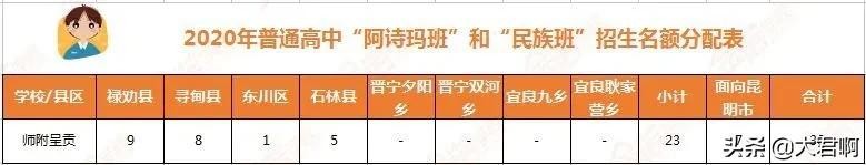 师大附中呈贡校区民族班计划招生 30 名。面向禄劝县、寻甸县、东川区、石林县户籍招收应届初中毕业少数民族学生 23 名,其中:禄劝县 9 名,寻甸县 8 名,东川区1 名,石林县 5 名。面向昆明市户籍应届初中毕业少数民族学生招收 7 名。