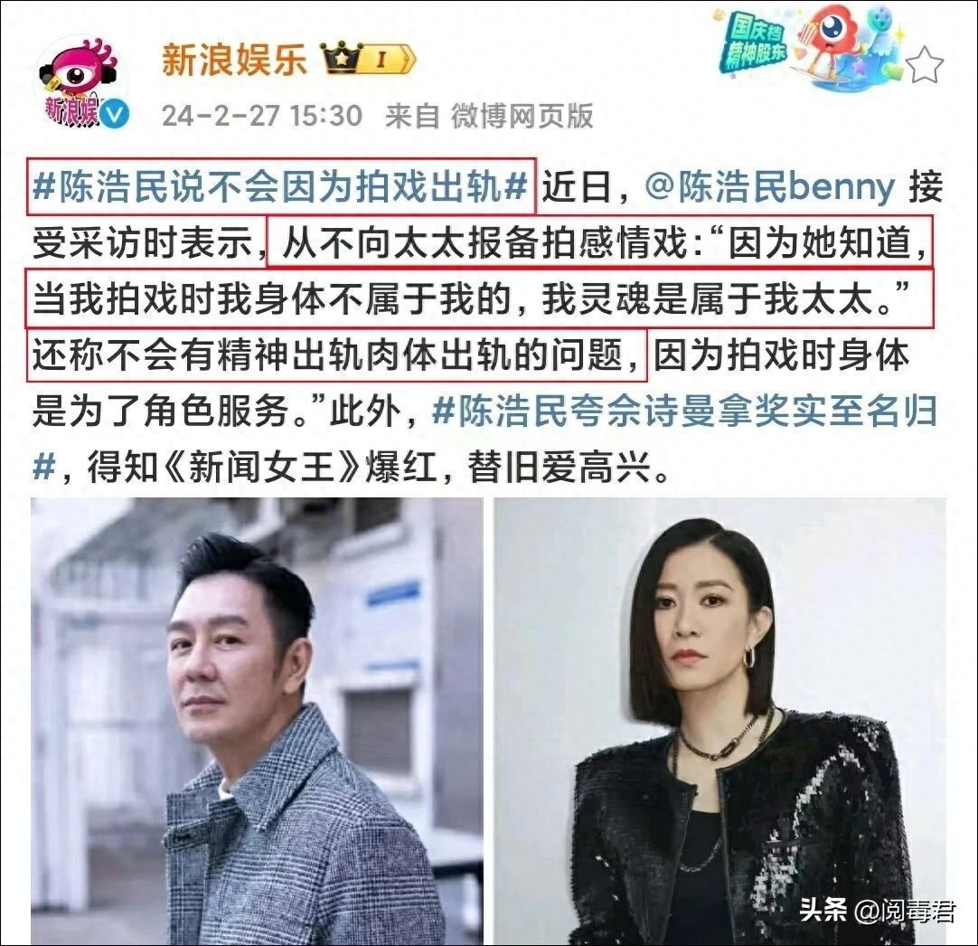 陈浩民最近接受了采访,说自己不会因为拍戏而出轨。