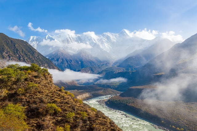雅鲁藏布大峡谷位于西藏自治区东南部,是世界上最深的峡谷之一。峡谷全长约505公里,最深处达6009米,平均深度约为2268米。雅鲁藏布大峡谷环绕着南迦巴瓦峰、加拉白垒峰等著名山峰,峡谷内河流湍急,瀑布高悬,自然景色十分壮丽。峡谷内生态系统复杂多样,拥有丰富的生物多样性,包括许多珍稀动植物。