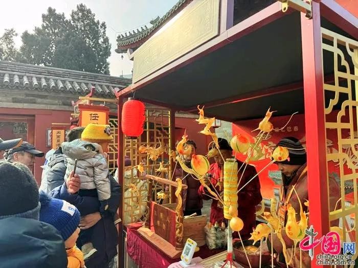 走进庙会的文化市集,游客们被琳琅满目的非遗手工艺品吸引。厚氏吹糖人的现场表演,吸引了无数小朋友驻足观看,糖画的精致和趣味让他们目不转睛。此外,面人、陀螺、空竹等传统技艺的展示,也让人们感受到浓厚的年味。