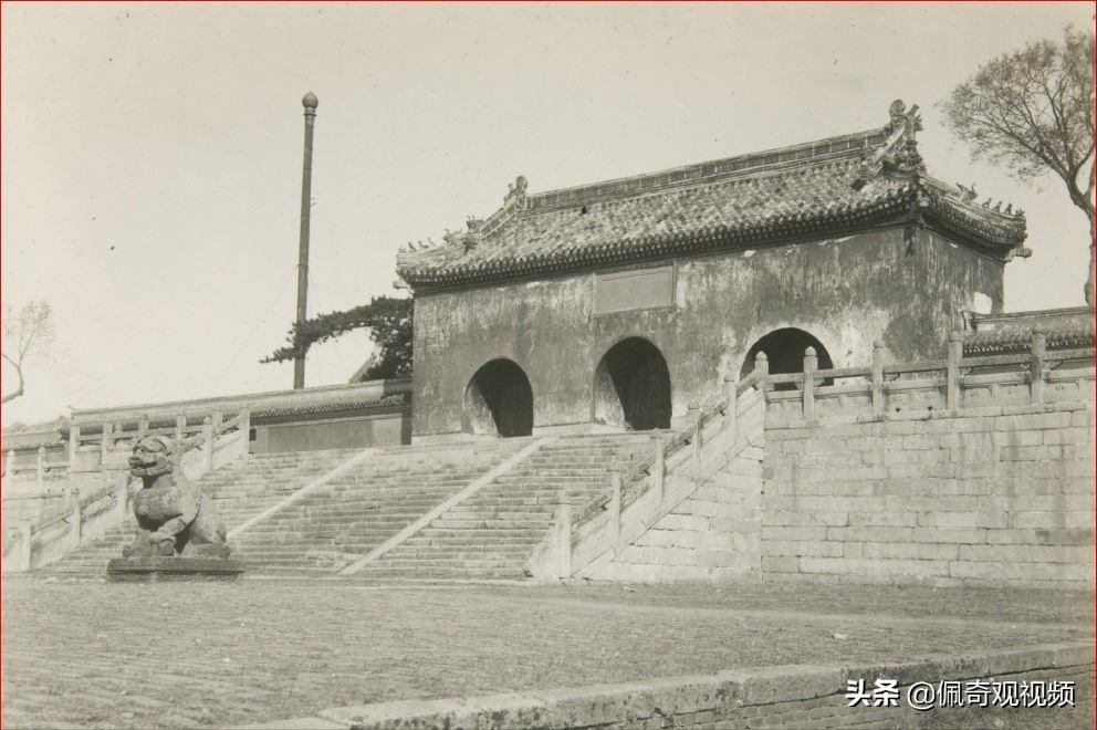 拍摄于1929年--辽宁 锦州 北镇 北镇庙 大门 庙利用丘陵的斜面,从南向北建筑逐渐增高,划分成了数个区域并都用石梯连接,第一层石梯在大门前,左右有高立着的石坛,门旁还设有勾栏增加了立体美,门的入口上的牌匾刻有北镇庙几个字。