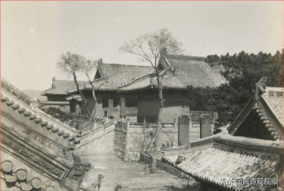 拍摄于1929年--辽宁 锦州 北镇 北镇庙 从鼓楼上俯瞰寺庙的中心区,右下角的屋顶是碑亭,稍远并列着的是各殿,依次是御香殿、大殿、内香殿、寝宫,其中大殿和寝宫是青色的琉璃瓦,也是庙中的大建筑,围着勾栏的高坛上的诸殿都是在清代经过重修的。
