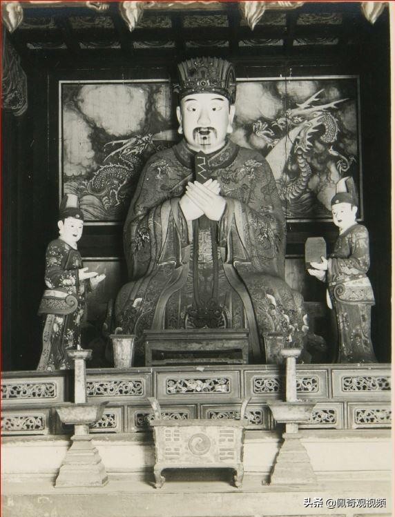 拍摄于1929年--辽宁 锦州 北镇 北镇庙 御香殿北 山神 北镇庙位于北镇(从前的广宁)县城的西边的丘陵上,是供奉山神的地方,规模之大在东北都是很少见的。御香殿位于庙中心的最南端,御香殿的北边有座大殿,里面供奉有山神像,山神指的是北镇医巫闾山的神明,所以这具雕像的样式也是新颖的。大殿内壁东西各有九幅人物的画像,这也是比较罕见的。