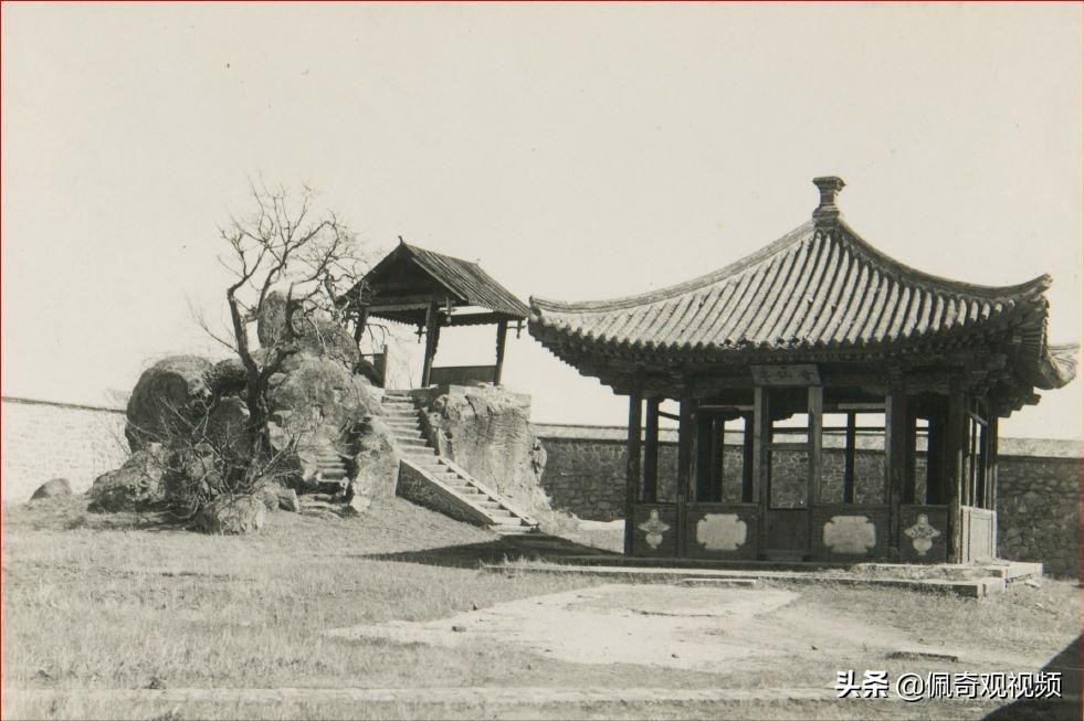 拍摄于1929年--辽宁 锦州 北镇 北镇庙 棋盘山 寺庙东边行宫的北边有一个比补天石还要大的岩石,因可以利用岩石来作为棋盘,故称棋盘山。虽说乾隆时代有茅草亭,但见到的大多数还是木板的屋顶,而眼前的亭子是瓦片顶的四角会仙亭。