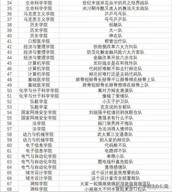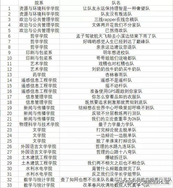 今年2月,武汉大学官方微博公布的新生辩论赛各参赛队队名,延续了往年的搞笑风格,毫无意外地又在网上火了一把。"辩论是非常严肃的事情,所以大家想在起队名时轻松、幽默些。"针对火了的队名,武大辩论队队长李楠如是说。虽然队名起的随意幽默了些,但武大新生辩论赛是各个院系都非常看重的赛事,大一新生们都会非常认真的准备,并不像起队名一样随意。