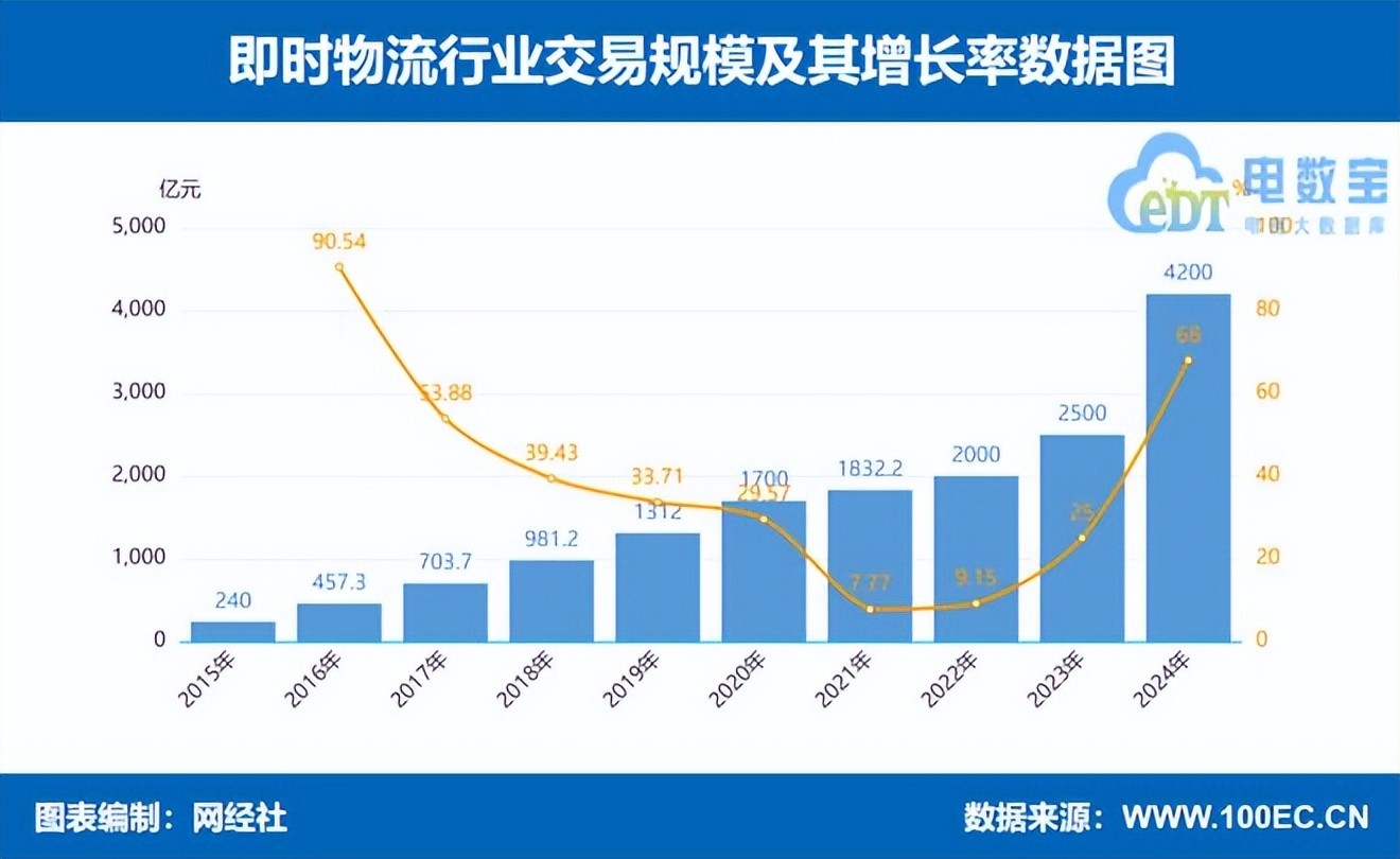 据“电数宝”数据显示,2024年即时物流市场规模4200亿元,同比增长68%。即时物流市场规模呈现爆发式增长,表明其正从“配送服务”进化为“城市基础设施”,不仅是外卖、生鲜小时达,还有无人车等,其影响将深入重塑零售、交通、就业乃至城市空间布局。