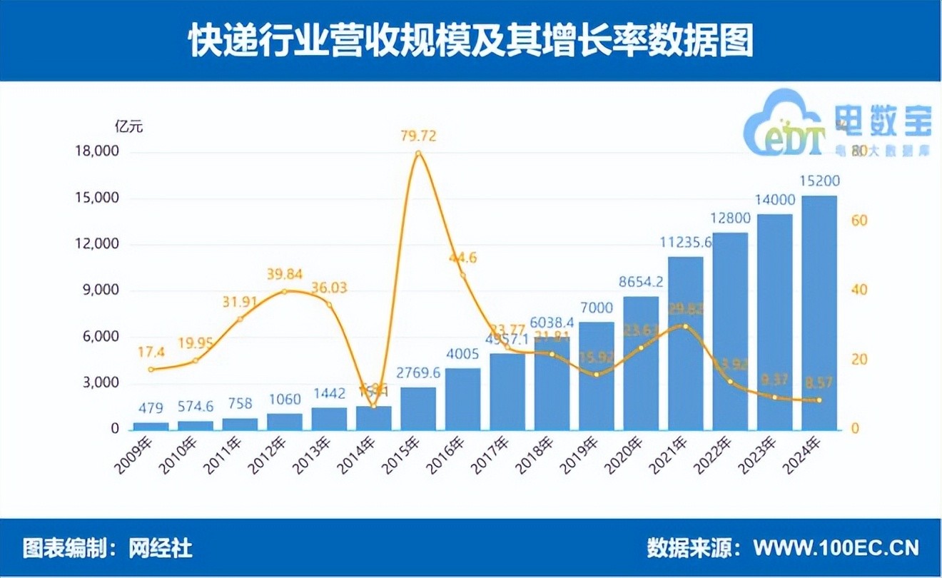 报告显示,2024年快递行业营收规模15200亿元,增速8.57%。其中,2015年增长率高达79.72%,从2017年-2019年增速分别为,23.77%、21.81%、15.92%,增速持平缓下滑,2021-2024年增速下降明显。
