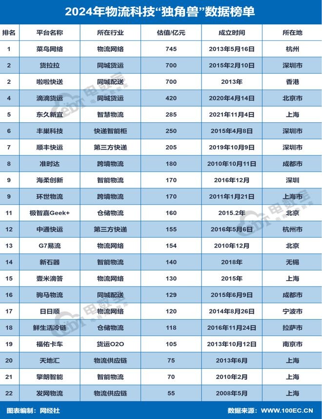 据“电数宝”显示,2024年,物流科技共有22家“独角兽”,总估值5236亿元。其中,菜鸟网络以745亿元估值位列“独角兽”榜第一名。
