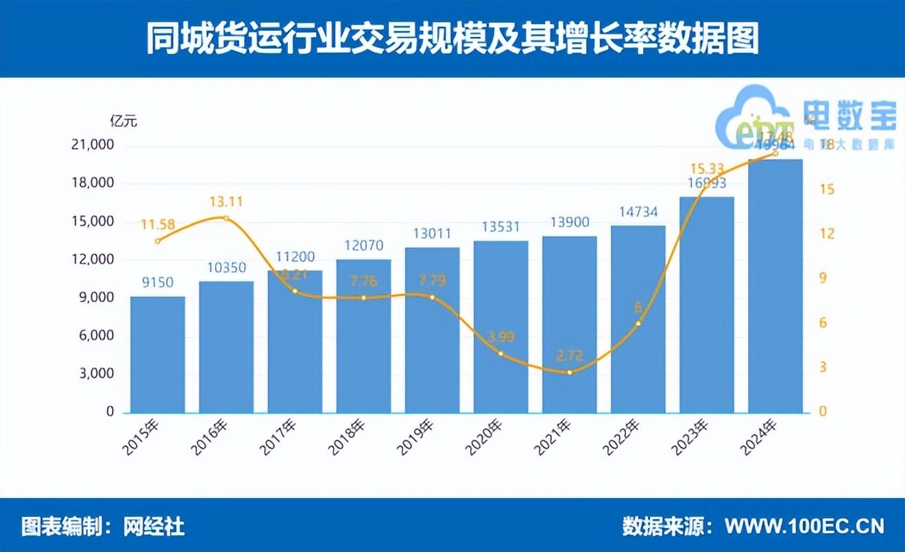 报告显示,2024年同城货运市场规模为19964亿元,同比增长17.48%。近年来,同城货运城市供应链韧性强化,应急物流需求激增:自然灾害、疫情等突发场景下,同城货运承担80%以上的物资调配;也带动生鲜冷链、家居配送等细分场景增长。