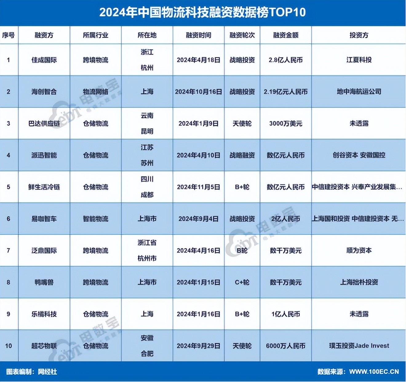 2024年物流科技24起融资事件中,融资额排名前十的为:佳成国际(2.8亿人民币)、海创智合(2.19亿元人民币)、巴达供应链(3000万美元)、派迅智能(数亿元人民币)、鲜生活冷链(数亿元人民币)、易咖智车(2亿人民币)、泛鼎国际(数千万美元)、鸭嘴兽(数千万美元)、乐橘科技(1亿人民币)、超芯物联(6000万人民币)。