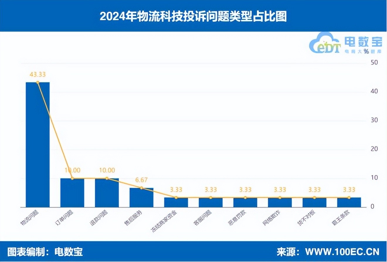 此外,据网络消费纠纷调解平台“电诉宝”受理用户维权案例显示,2024年全国物流科技用户投诉问题类型主要包括:物流问题、订单问题、退款问题、售后服务、冻结商家资金、客服问题、恶意罚款、网络欺诈、货不对板、霸王条款。
