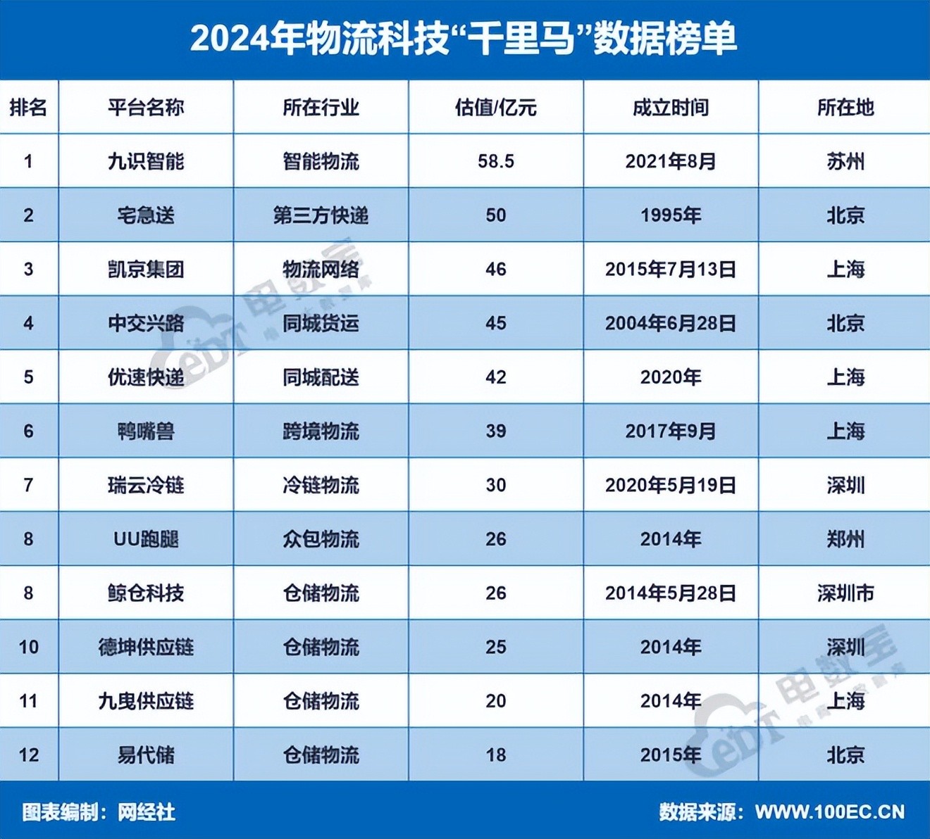 此外,2024年,物流科技共有12家“千里马”,总估值425.5亿元。分别是:九识智能、宅急送、凯京集团、中交兴路、优速快递、鸭嘴兽、瑞云冷链、UU跑腿、鲸仓科技、德坤供应链、九曳供应链、易代储。