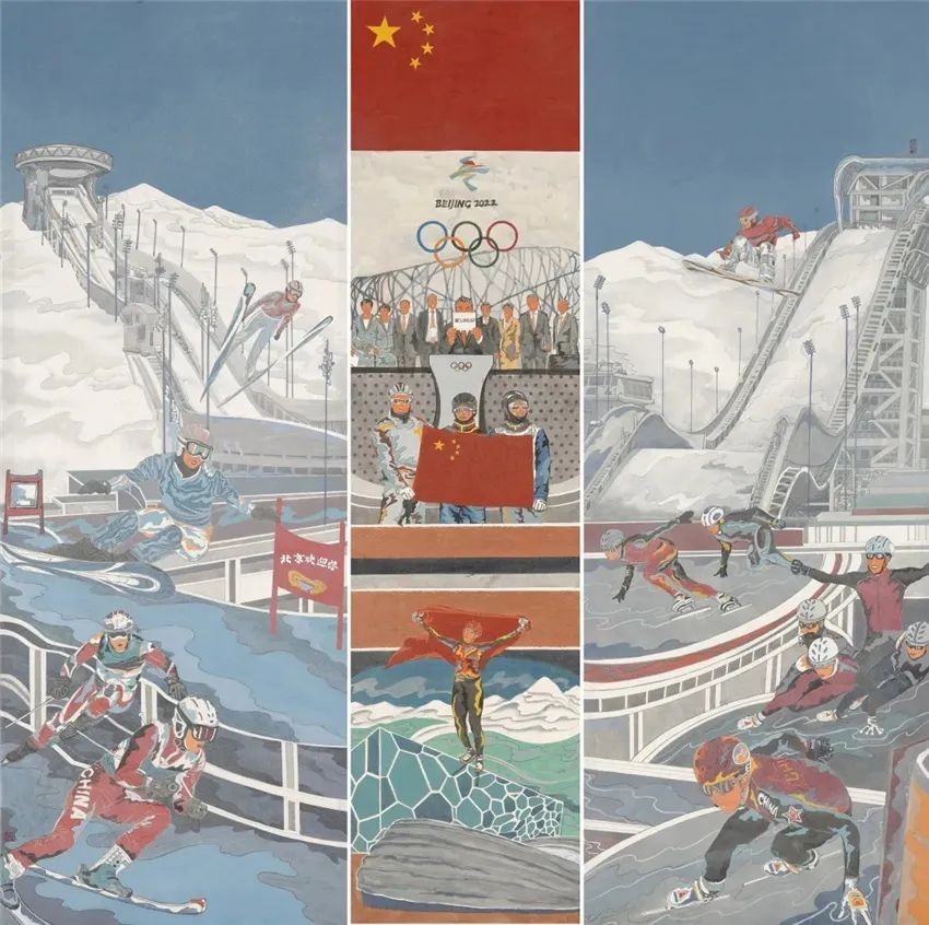 从“2022第九届中国北京国际美术双年展”“迎冬奥·美在逐梦——中国美术馆藏体育题材美术作品展”“天地人和——中国国家画院2022北京冬奥主题美术·书法作品展”,到各地冰雪主题美术作品展,美术工作者纷纷以艺术寄情冬奥,通过融汇冰雪运动形象和冬奥元素的丹青妙笔,细致表现冰雪运动中的力与美,生动展现生命绽放的光彩,深刻诠释“更快、更高、更强——更团结”的奥林匹克格言。