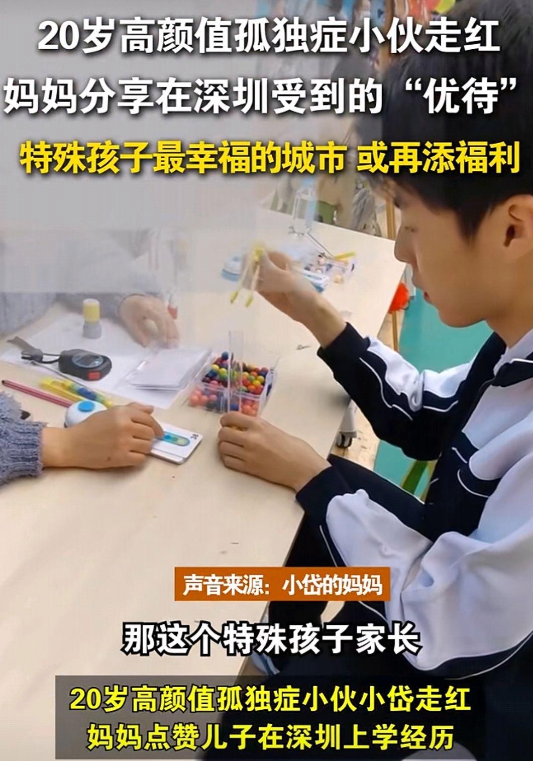 2月28日,广东深圳一位20岁高颜值自闭症男生的日常生活引发关注。小岱身材高大瘦削,长得像明星王一博,眼神被认为干净清澈,生动诠释了什么叫星星的孩子。
