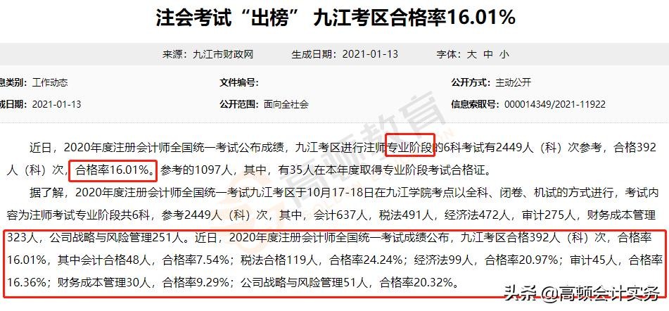 江西九江2020年各科通过率情况:专业阶段考试通过率16.01%,其中会计合格率7.54%;税法合格率24.24%;经济法合格率20.97%;审计合格率16.36%;财务成本管理合格率9.29%;公司战略与风险管理合格率20.32%。