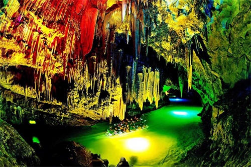 想象一下,你正坐在一艘小船上,四周是幽深的溶洞,钟乳石在灯光的照射下,像极了电影里的神秘宝藏。