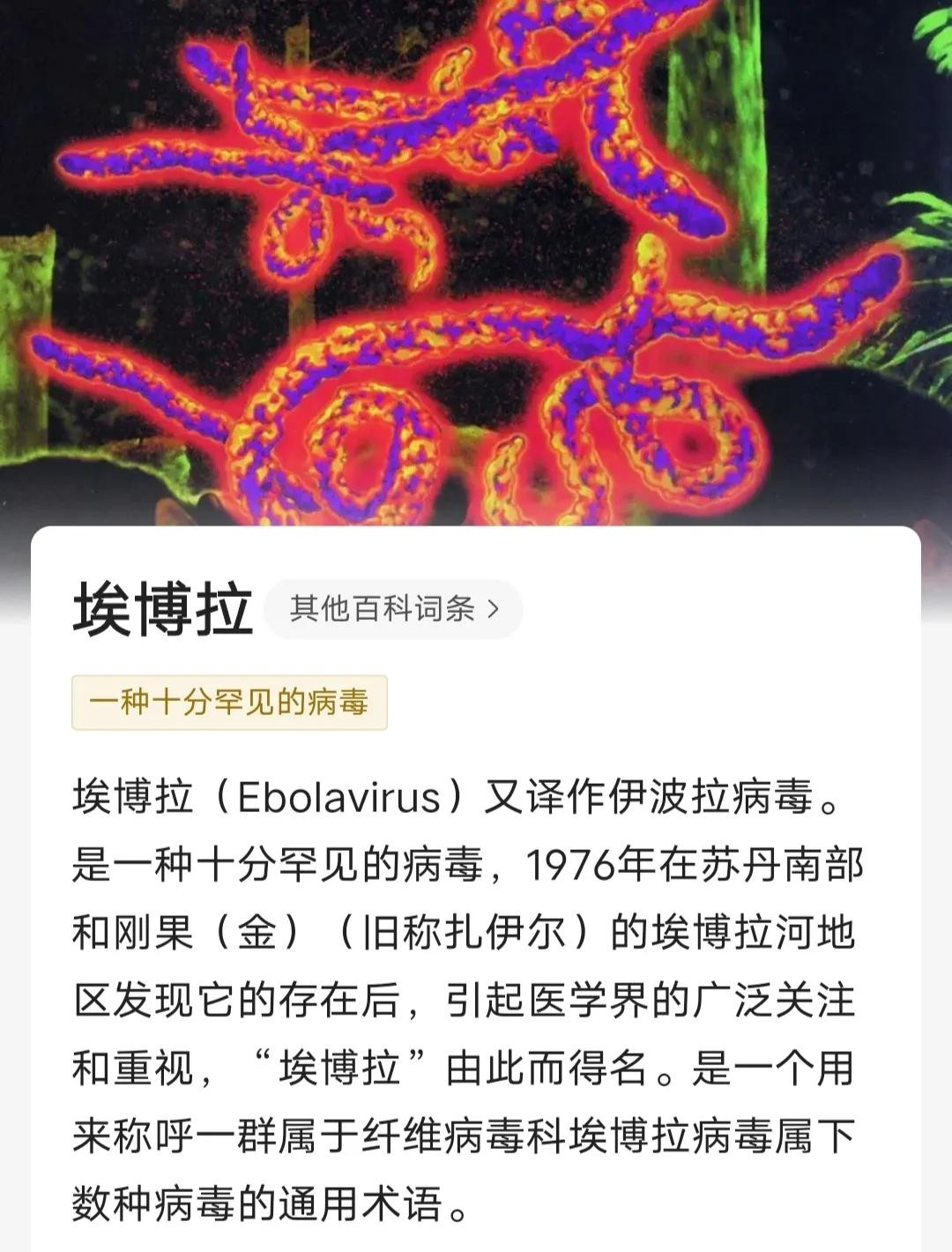 埃博拉病毒在1976年已经出现,至今已经过去几十年还没有特效药能治疗,致死率能到达50-90%,传播途径主要有体液、血液、分泌物等方式,比起新冠病毒的空气传播稍显仁慈。