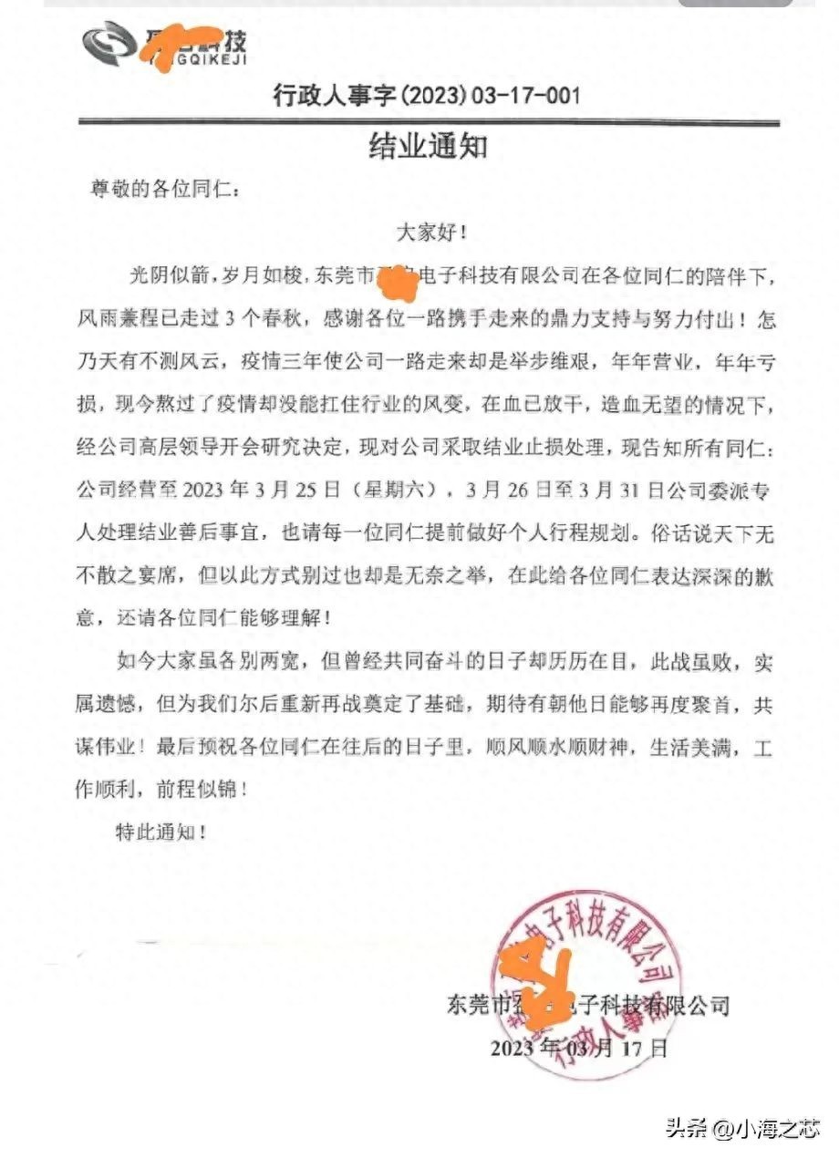 3月17日,东莞市一电子科技有限公司发布结业通知,通知表示,疫情三年使公司一路走来举步维艰,年年营业年年亏损,现今熬过了疫情却没能抗住行业的风变,在血已放干,造血无望的情况下,经公司高层领导开会研究决定,对公司采取结业止损处理。
