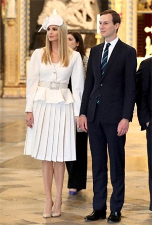 而上周访问英国的时候,必然要去见见英国王室的成员,伊万卡穿上这样一身白色的套装搭配着白色的礼帽,高贵的样子就轻而易举的表现了出来。伊万卡对于百褶裙还真是非常爱,这套裙装用一根腰带提高腰线,显得比例就更好了!