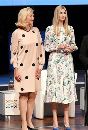 而我们可以看到伊万卡在欧洲访问的时候,穿着这样的印花裙亮相,非常具有小清新的风格,而且上面的图案也是具有东方美,伊万卡不仅是展现着自己超高的才华,而且是展现着自己作为第一千金无限的魅力。伊万卡对于色彩的搭配也是非常注重,蓝色的高跟鞋和裙子的色彩匹配,不会太过于夸张。