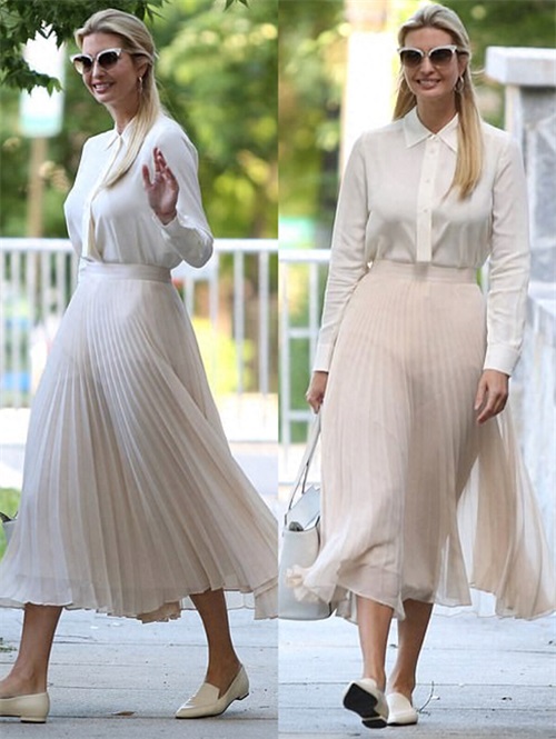 而猫眼形状的墨镜更是今年的流行趋势,伊万卡平常都是以中分发型亮相,这一次伊万卡换了一个非常优雅的公主头发型,就更加显得温婉了!37岁的伊万卡完全看不出是生过三个孩子的妈妈,第一千金无论是霸气路线还是少女风路线,似乎对她来说都是没有任何难度的。但是伊万卡当天搭配的这条百褶裙,折合人民币大概要3000多块钱,这就让人有些理解不了,很多人觉得这样夏天必备的百褶雪纺裙,也就是几百块钱的样子。虽然说我们不用去买这么贵的同款裙子,但是我们可以借鉴这样的搭配方式呀!相信很多人衣橱中都有这样非常简约的白衬衫,而搭配上一条白色裙,这样就是简直就是将中性风和少女风完全结合在了一起。