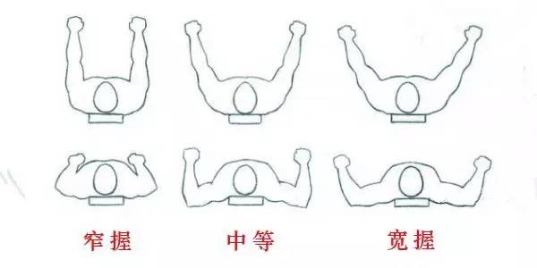 宽或窄都没有明确的定义,我们如何辨别?一般情况下:最低点时前臂与地面角度小于90度,则为窄距卧推(下称窄握);最低点时前臂垂直于地面时,则为普通卧推(下称中等握距);最低点时前臂与地面夹角大于90度时,则为宽距卧推(下称宽握)。具体看下图: