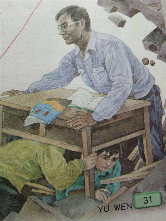 谭千秋老师没有一刻犹豫,就飞身扑过来把他们塞到课桌下护住他们。随后教室就倒塌了。