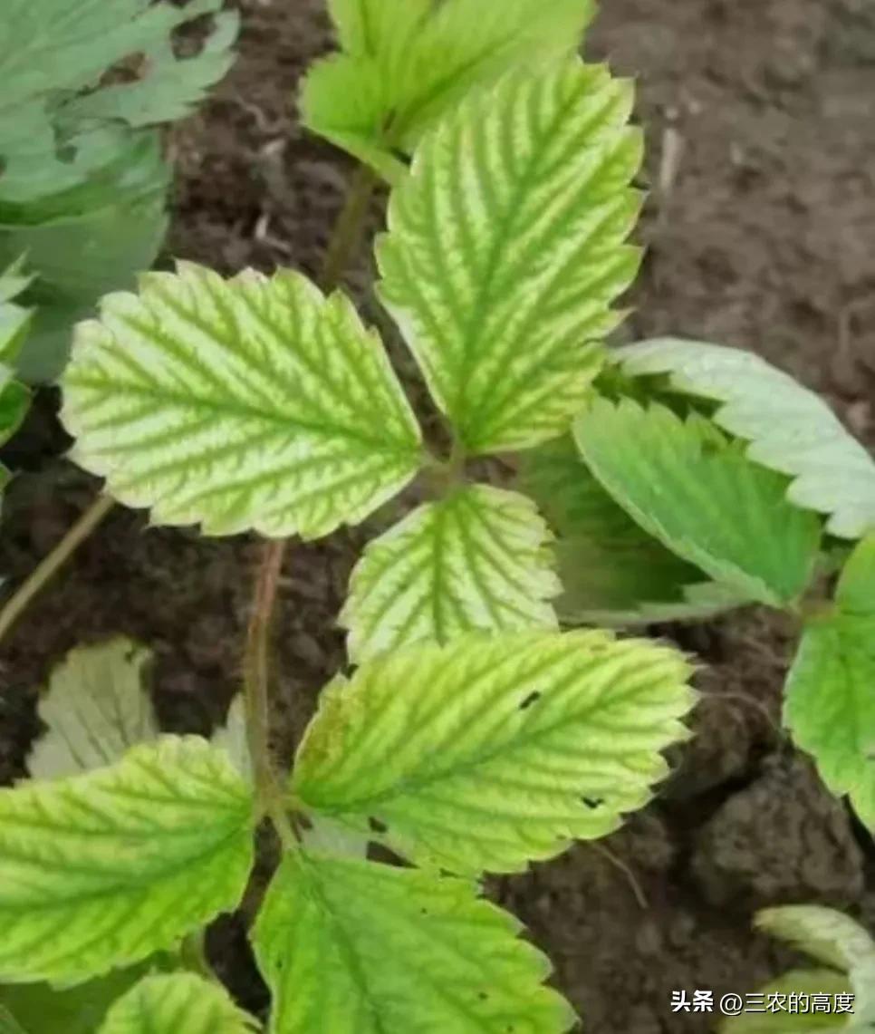 草莓植株叶片失绿、黄化呈斑驳状,是病虫害所致吗?缺铁症就如此。