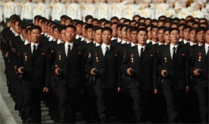 最近朝鲜举行了庆祝朝鲜战争胜利70周年的盛大阅兵,朝鲜领导人在中俄来访的官员陪同下一起出席观礼,阅兵式上先后亮相了朝鲜自研的先进无人机和固体机动式洲际弹道导弹外,还有一支神秘的阅兵方阵引起了网友的关注,是一直徒步方阵,其特征并不是朝鲜的海陆空三军部队,这支奇特的阅兵方阵,人人梳理小平头,身穿西装黑领带,头带黑色墨镜,胸前别着徽章和勋章,这是此前从未出现过的一支队伍,他们并未手持武器参加阅兵,而是举起自己的旗帜迈步前进。那么这些“黑衣人”部队组成的方阵,到底是什么来头?
