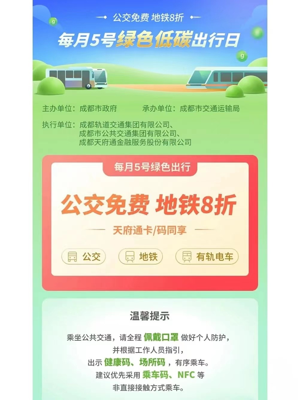 原来是从这个月开始,成都开展的“每月5号绿色低碳出行日”活动,每月5号公交免费,地铁八折,尾号不限行。