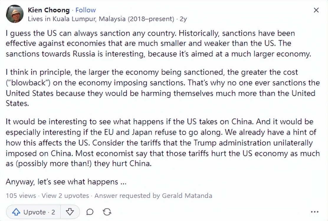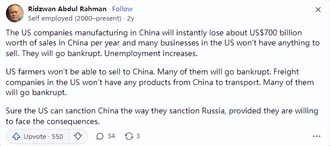 紧接着来自马来西亚的网友评论道,当然,如果美国这样做了,那与中国的贸易战将会比制裁俄罗斯更严重,美国所有的公司都依赖来自中国的产品。