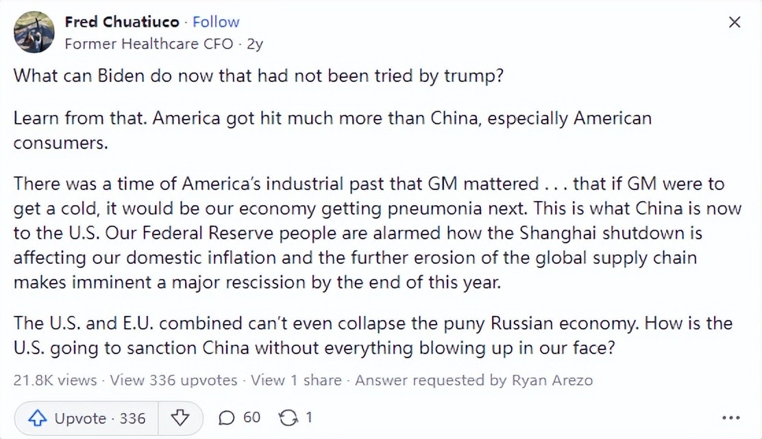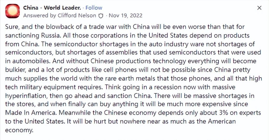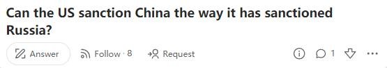 一位美国网友,他在国外最大的问答网站Quora上提出了一个问题:“美国能像制裁俄罗斯那样制裁中国吗?”作为俄乌战争的最大推手,美国不仅大发战争财,甚至还联合西方对俄进行制裁。