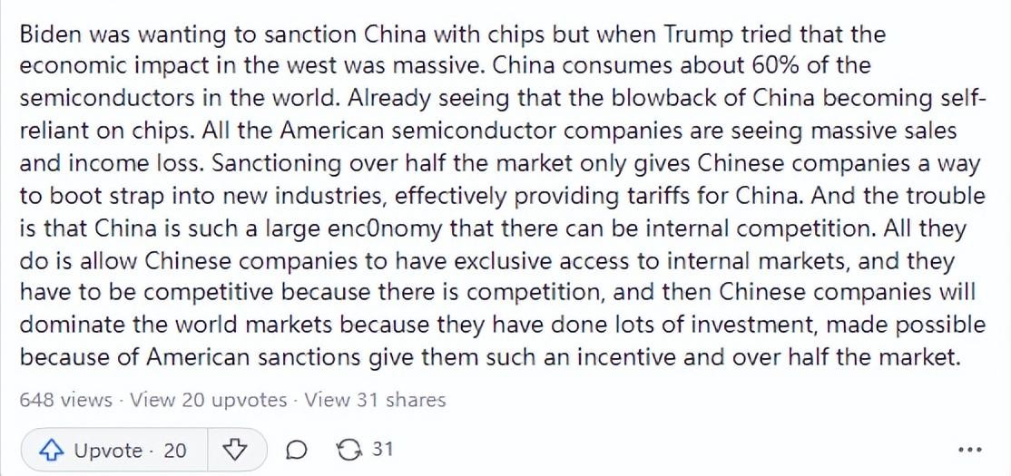 拜登曾想通过芯片制裁中国,但当特朗普尝试这样做时,对西方的经济影响是巨大的,中国消耗了世界上约60%的半导体,可以中国拥有极大的芯片市场。