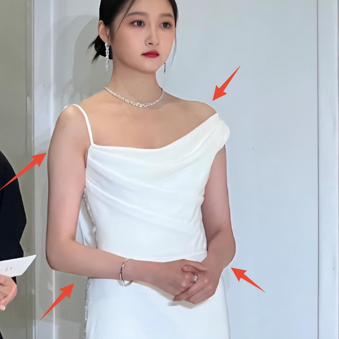 白色长裙虽然优雅,但收腰设计没有凸显她的身材优势,反而让她显得有些臃肿。