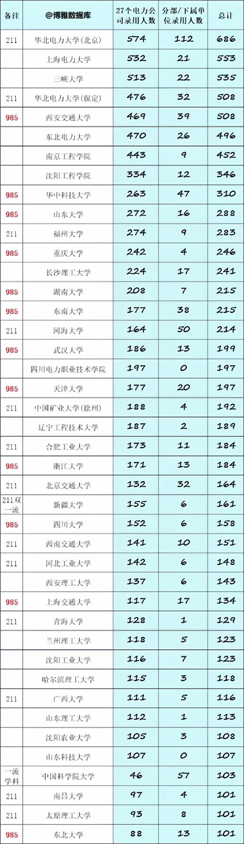 可以说无论是从学校档次、教学水平还是科研实力上来看,华北电力大学的实力都是非常强大的,并且在就业上的表现也非常不错。从原国家电力公司划转教育部管理,成为教育部直属高校后,它同时还是国家电网有限公司、中国南方电网有限公司、中国华能集团有限公司等国内12家特大型电力企业和中国电力企业联合会组成的理事会与教育部共建高校,可见它仍然拥有浓厚的电力系统背景。因此在历年的电网招聘中,华北电力大学的毕业生都是招录人数最多的高校,并且远超其它学校。