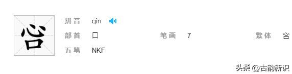从上图中我们可以看到,“吢”字的汉语拼音读作【qìn】,读第四声,音同“沁”。上下结构,部首是“口”字,总笔画是7笔。
