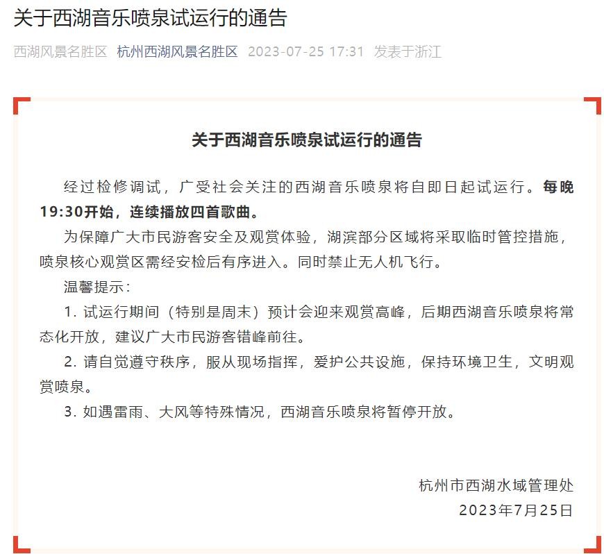 7月25日,据杭州西湖风景名胜区:经过检修调试,广受社会关注的西湖音乐喷泉将自即日起试运行。每晚19:30开始,连续播放四首歌曲。