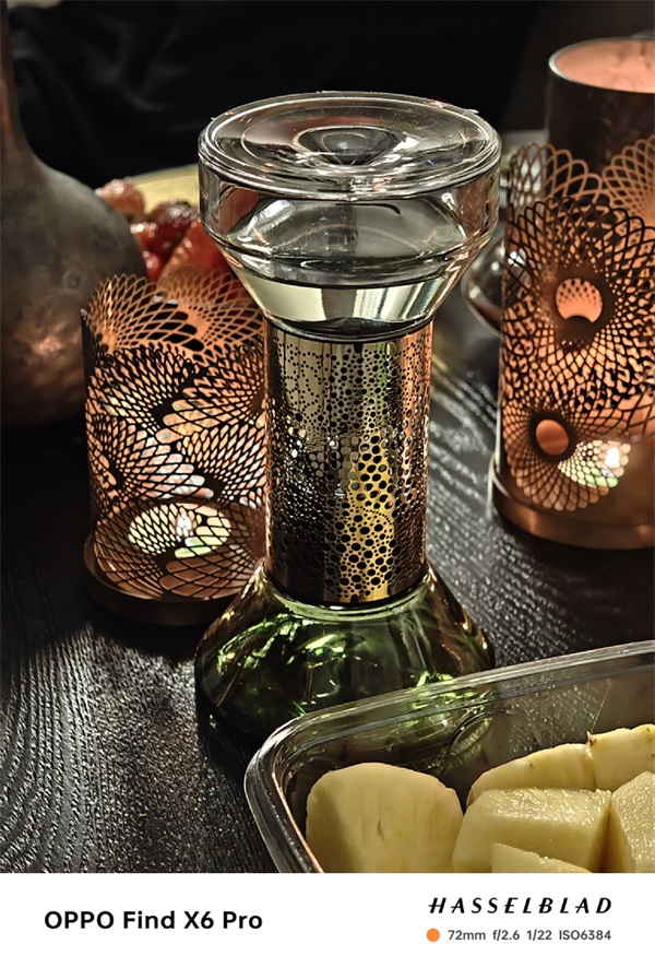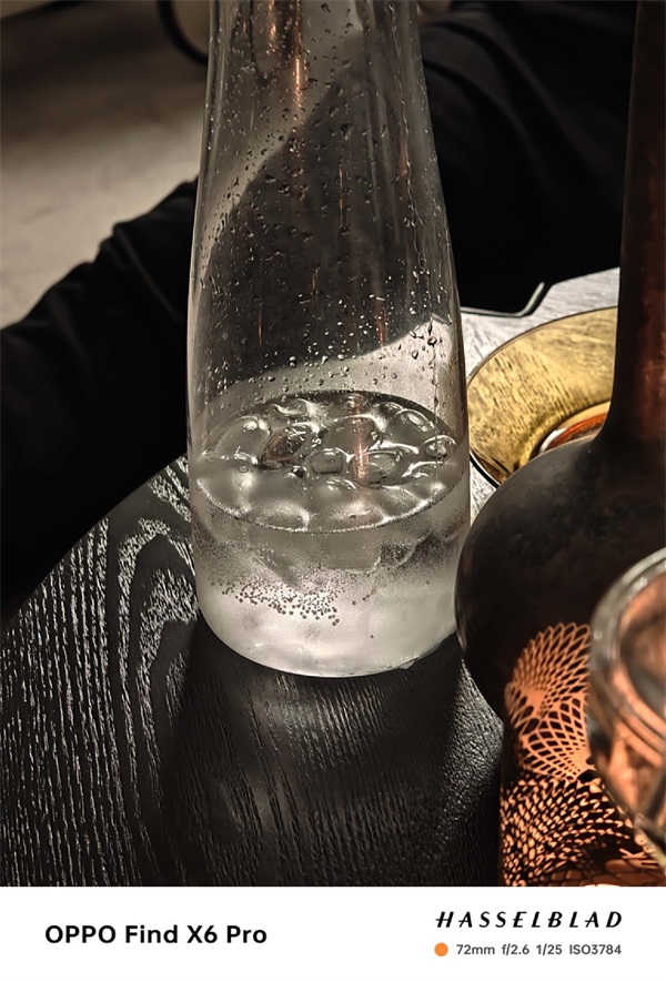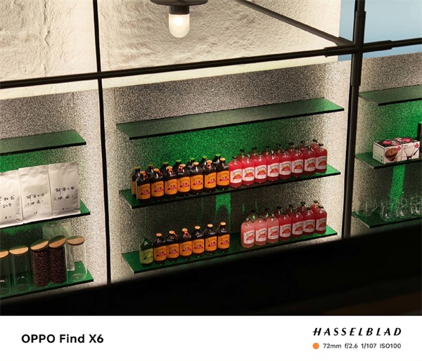 在 OPPO Find X6 的镜头和超光影图像引擎算法加持下,让样张呈现出了极强的视觉层次感,比如上方墙壁的曝光恰到好处,算法并没有死死压住高光部分,反而让它略有一点点的溢出。暗部的玻璃柜也没有粗暴的拉高亮度,瓶子背后暗光区域也“暗”得恰到好处,这种高光到暗部的亮度差充足,墙壁、灯光的高光部分与玻璃、透明部分形成了强烈的对比,亮部区域更亮,暗部更纯粹,由此样张呈现出了非常强烈的通透感和立体感。