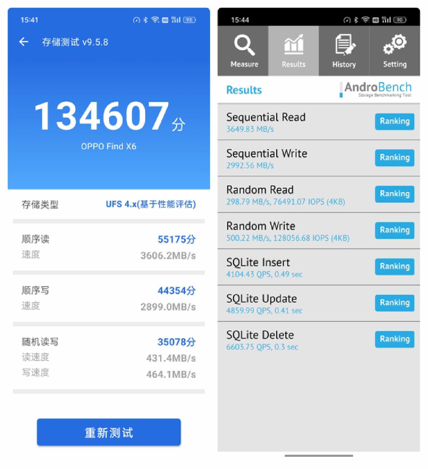 UFS4.0 加持,OPPO Find X6 在 Androbench 中跑出了 3649MB/s的读取成绩,写入成绩更是达到了 2992MB/s,远超 UFS 3.1 的 1800MB/s左右的成绩,在安兔兔的存储测试中,分数达到了 13 万 +,相较于 UFS 3.1 提升相当明显。