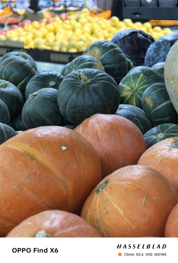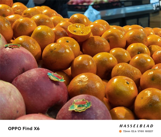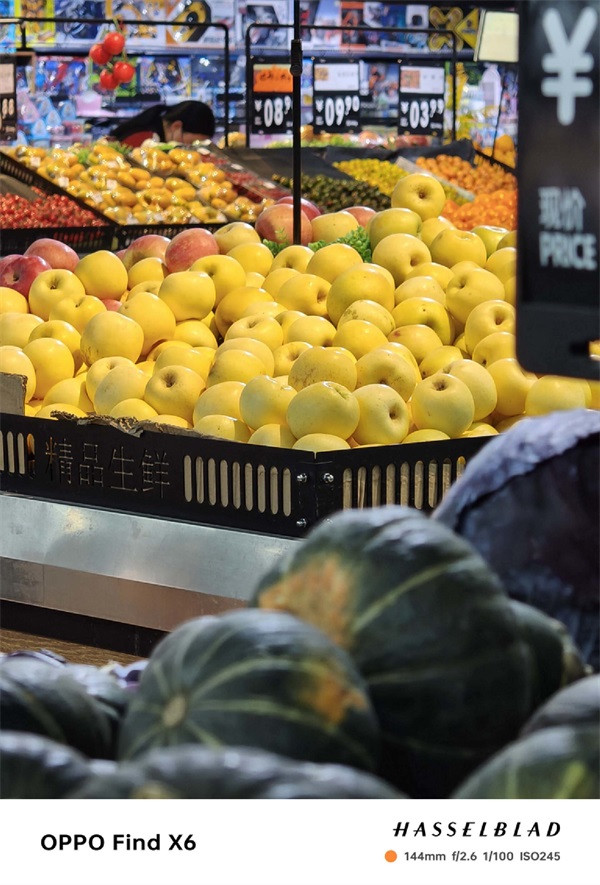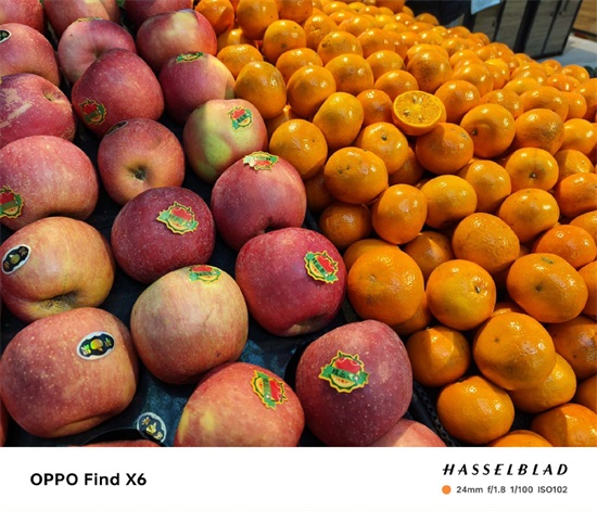 再比如上面这张由主摄拍摄的水果样张,灯光下橘子反射了顶部的光源,每个橘子都很光亮,高光和反光非常明显,看起来“油油”的,而苹果的轮廓也非常立体。