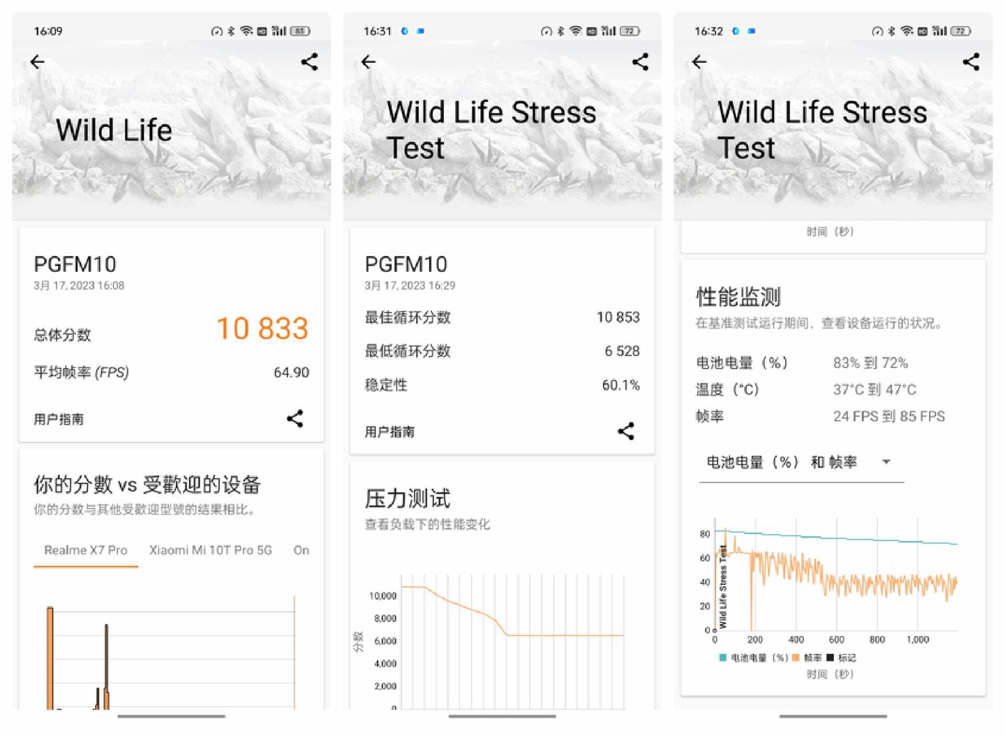 连续 20 轮 3D Mark Wild Life,OPPO Find X6 的稳定性达到了 60.1%,单轮的 Wild Life 跑分达到了 10833,平均帧率为 64.90fps,依旧是当下的旗舰水准,60.1% 的稳定性也证明调教过往要略“激进”一些。