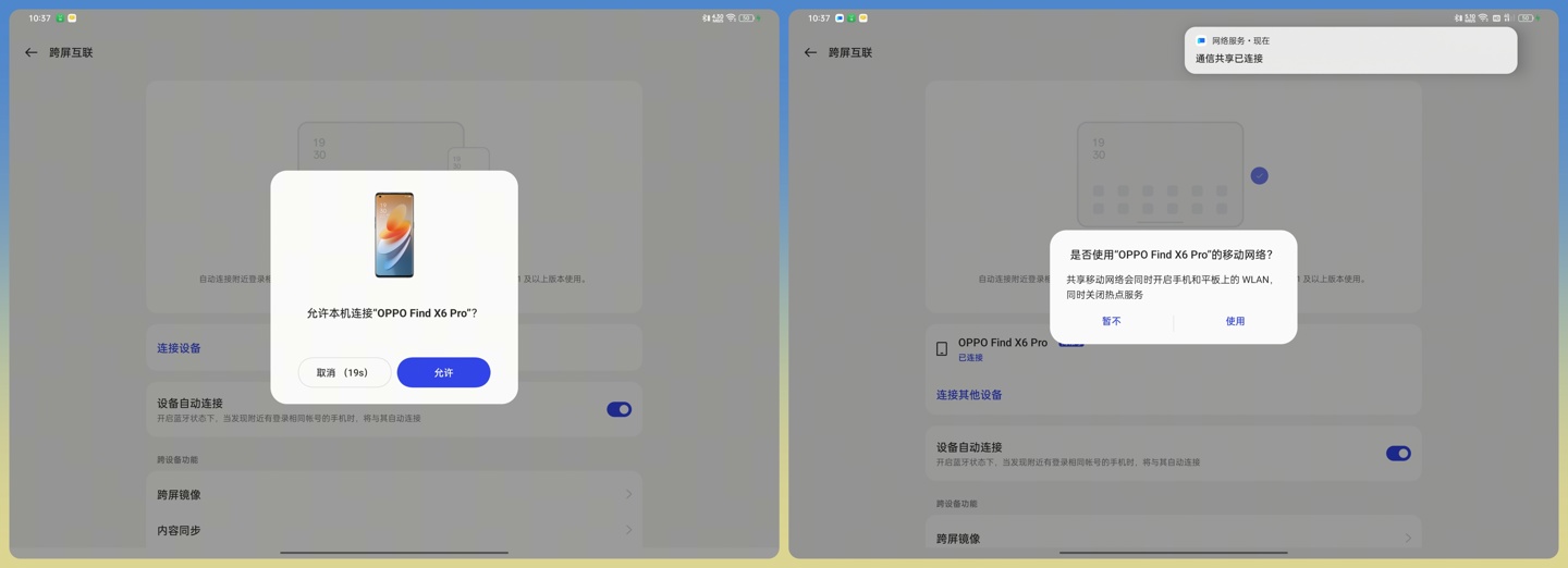 操作也相当简单,OPPO Pad 2 搭配全新的 OPPO Find X6 系列手机(支持 ColorOS 13.1 版本以上),登录同一账号,无需在一个局域网内,在跨屏互联设置中,开启蓝牙,找到待连接的设备即可。