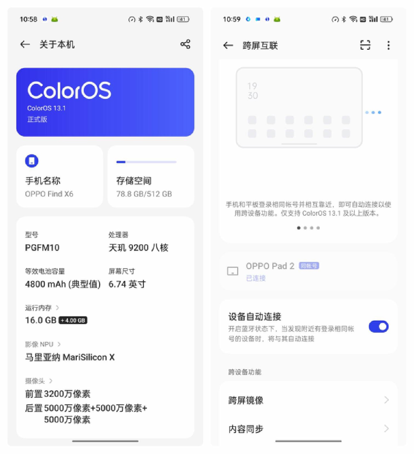 ColorOS 13.1 同样支持“跨屏镜像”持,开启后,手机即可“投屏”至平板上,平板可直接操作手机上的所有内容,手机和平板之前也可以通过拖拽实现文件传输等。