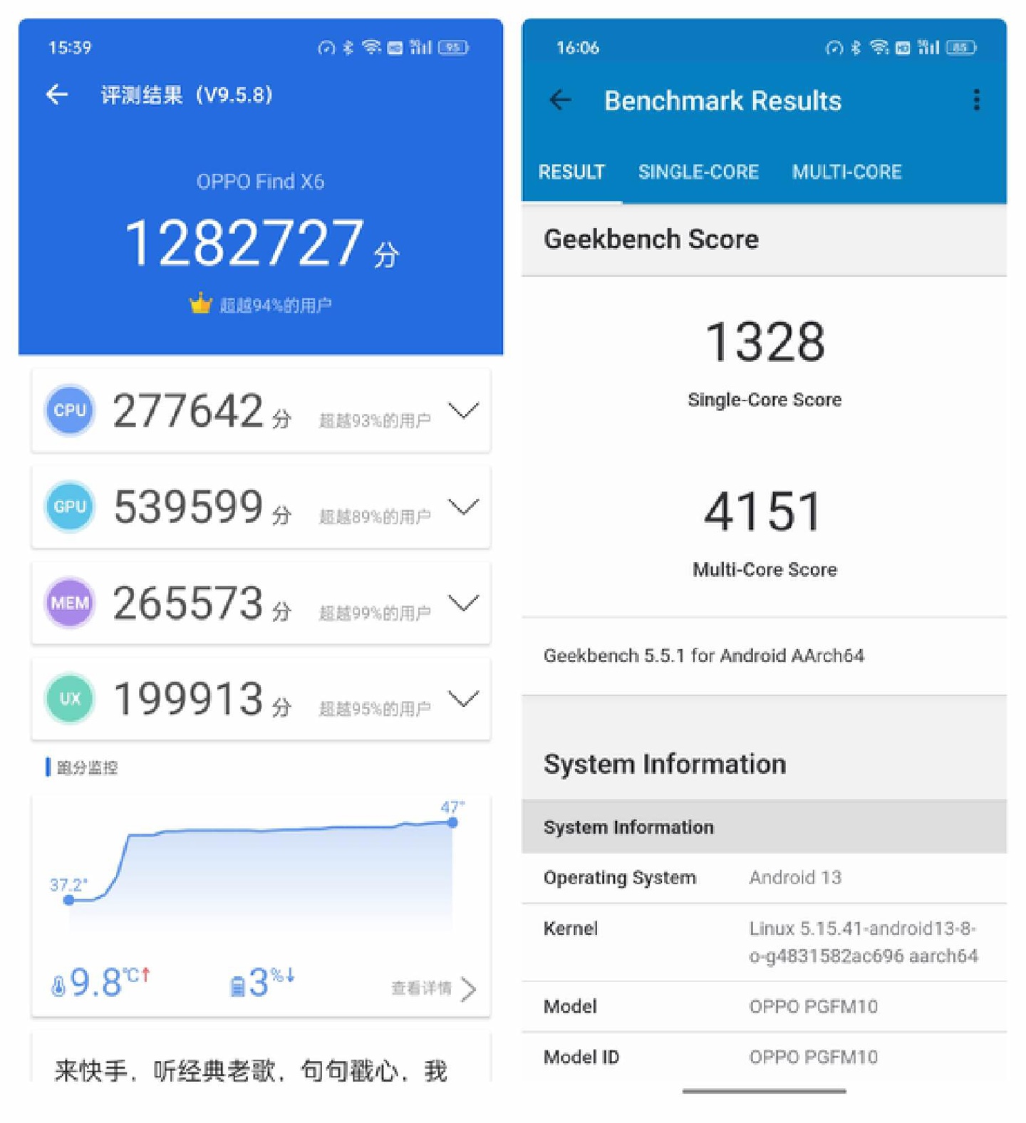 不过在 GeekBench 5 跑分上,OPPO Find X6 的单核 1328 分,多核 4151,多核成绩要比想象中略低,或许是系统固件问题?